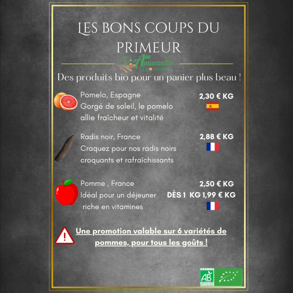 Les Bon Coups du primeur Auteur/autrice de la publication :amaranthe-admin Publication publiée :14 décembre 2025 Post category:Non classé Commentaires de la publication :0 commentaire Découvrez nos promotions sur les fruits et légumes, du 6 au 10 janvier 🍎🥕 Vous devriez également aimer Offres Filtration d’eau 18 mars 2025 Bon coups du primeur 21>25 janvier 18 janvier 2025 Animation famille Teulet 4 décembre 2024 Laisser un commentaire Annuler la réponseCommentEnter your name or username to comment Enter your email address to comment Saisir l’URL de votre site (facultatif) Enregistrer mon nom, mon e-mail et mon site dans le navigateur pour mon prochain commentaire.