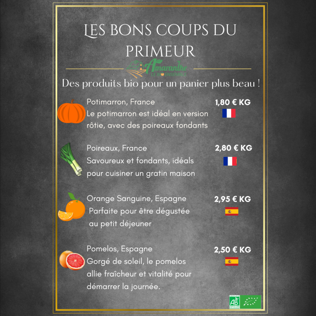 Les Bon Coups du primeur Auteur/autrice de la publication :amaranthe-admin Publication publiée :14 décembre 2025 Post category:Non classé Commentaires de la publication :0 commentaire Découvrez nos promotions sur les fruits et légumes, du 20 au 24 janvier 🍎🥕 Vous devriez également aimer bons coups du primeur 18 mars 2025 Les Bon Coups du primeur 24 juillet 2025 Les bon coups du Primeur >30/11/24 26 novembre 2024 Laisser un commentaire Annuler la réponseCommentEnter your name or username to comment Enter your email address to comment Saisir l’URL de votre site (facultatif) Enregistrer mon nom, mon e-mail et mon site dans le navigateur pour mon prochain commentaire.